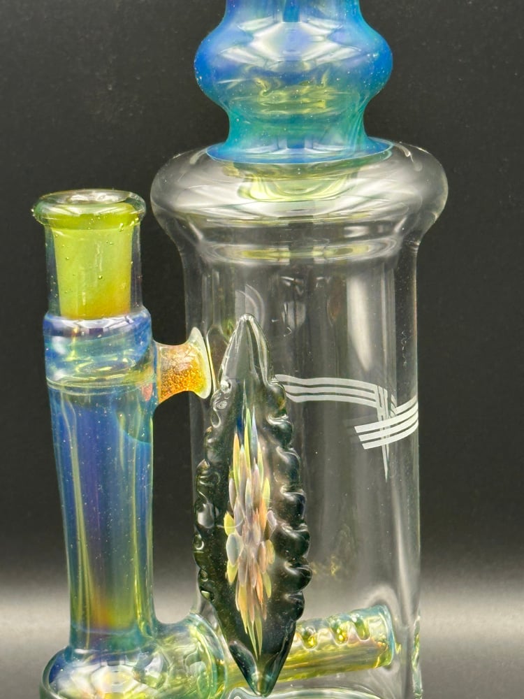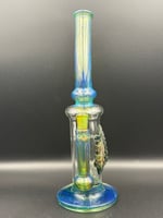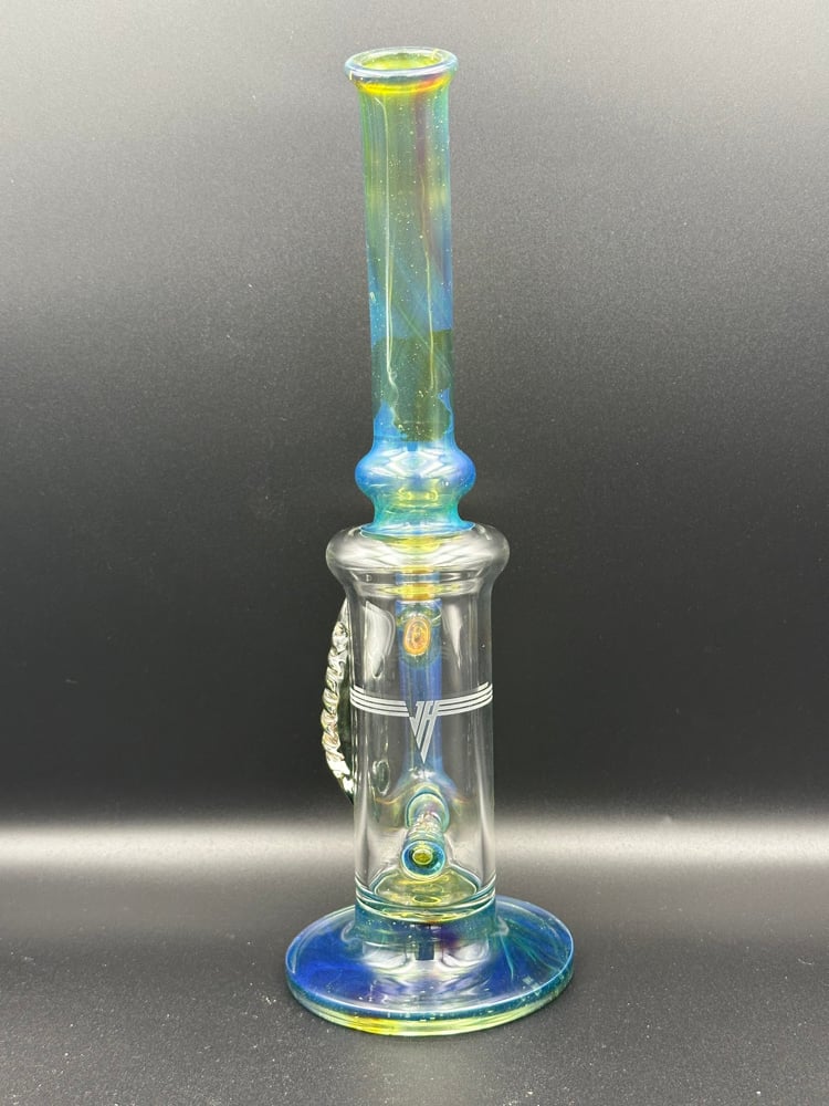 This amber/green mini stem line stands 11 inches tall with 3.5 inch base. This piece is simple and clean with 10 female hand ground joint to a 4 slit gridded perk. This piece also has a simple gold and silver fumming implosion attachment