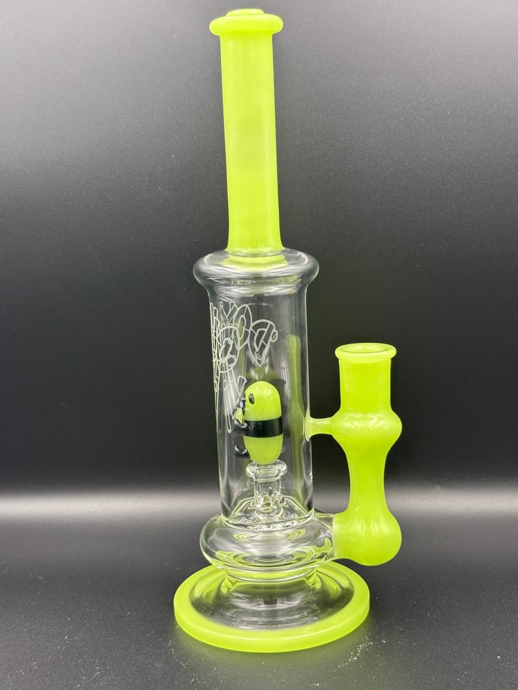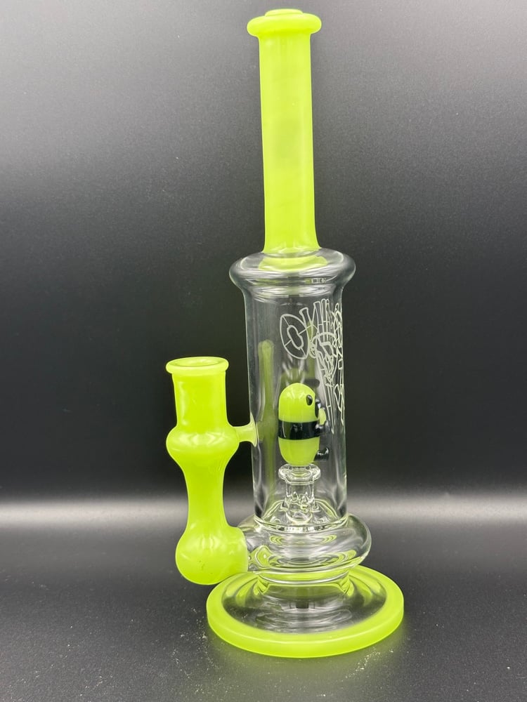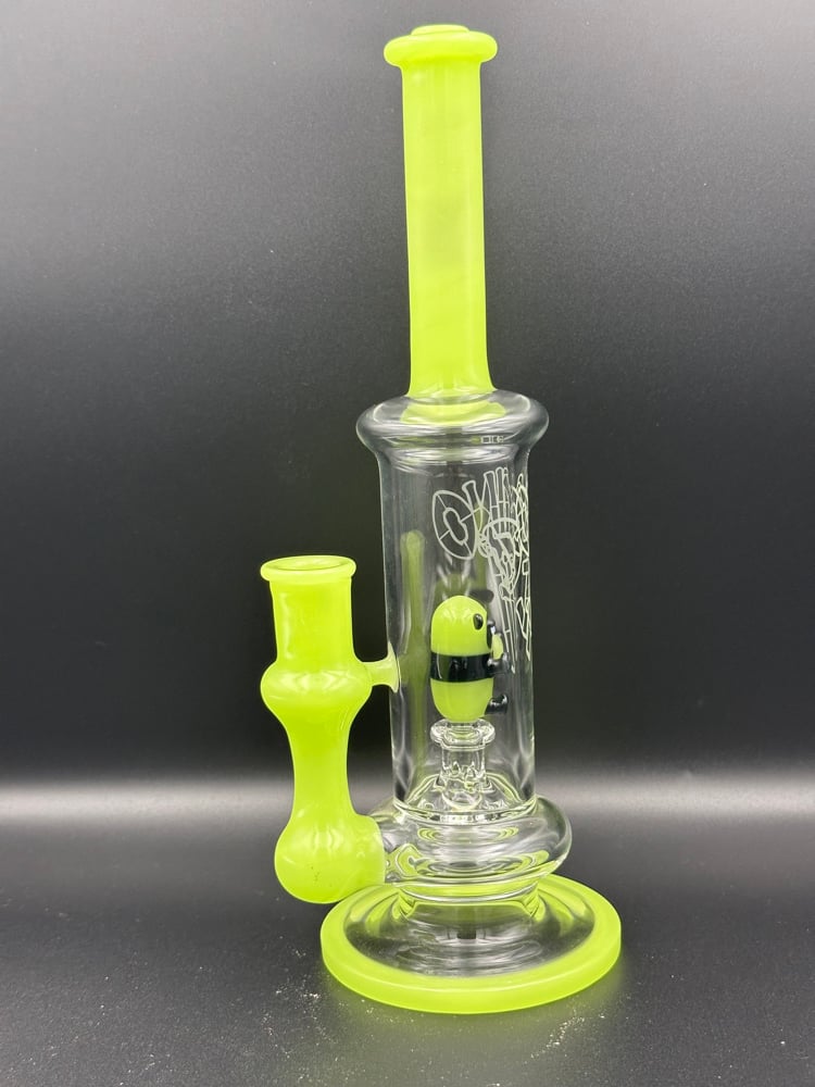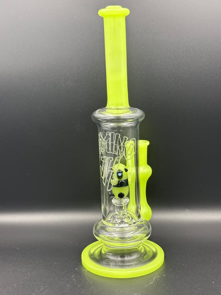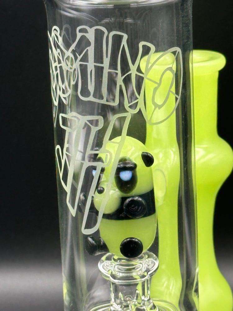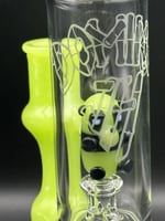 This avenger blooper collab with domino glass features a panda sitting on the blooper perk. This piece sits 11 inches tall with 3.5 base and a hand worked 14 female joint it comes with a adapter to make it 10 mm off preferred. This piece also features a custome sandblasted logo.