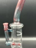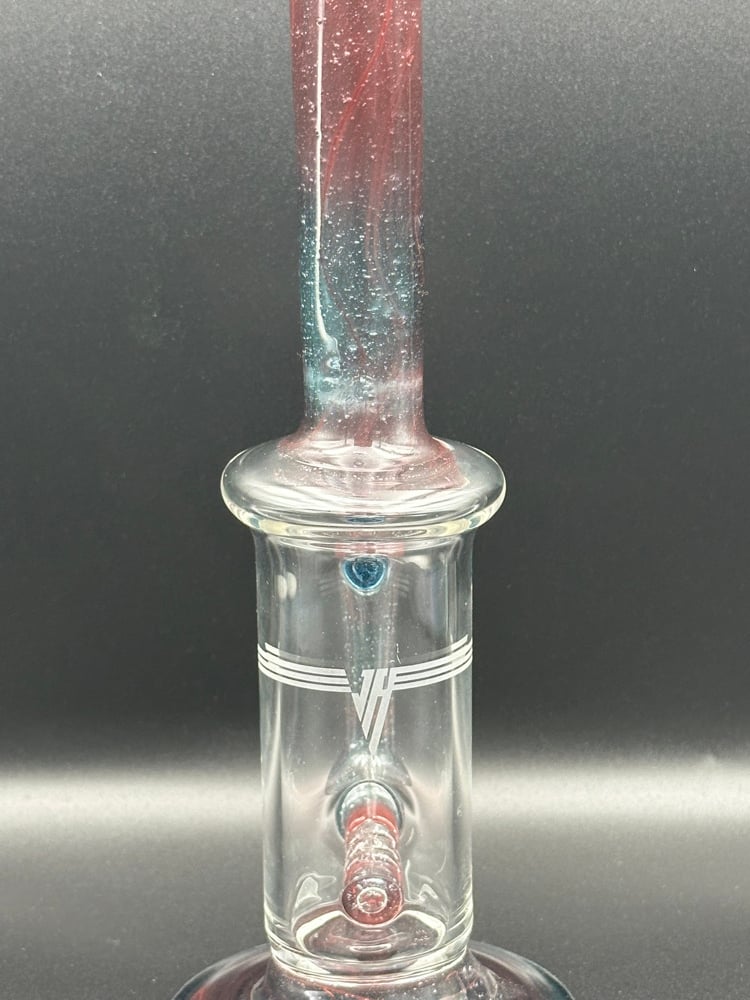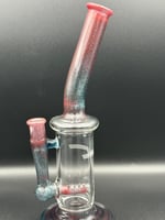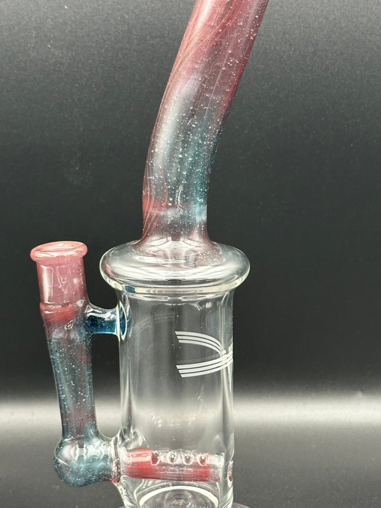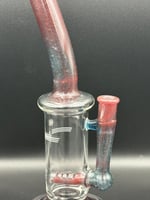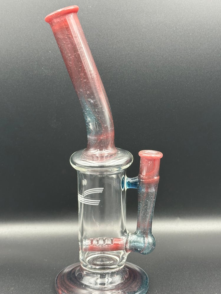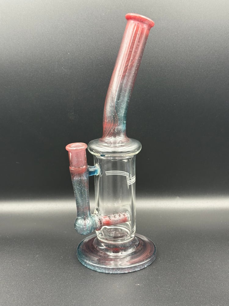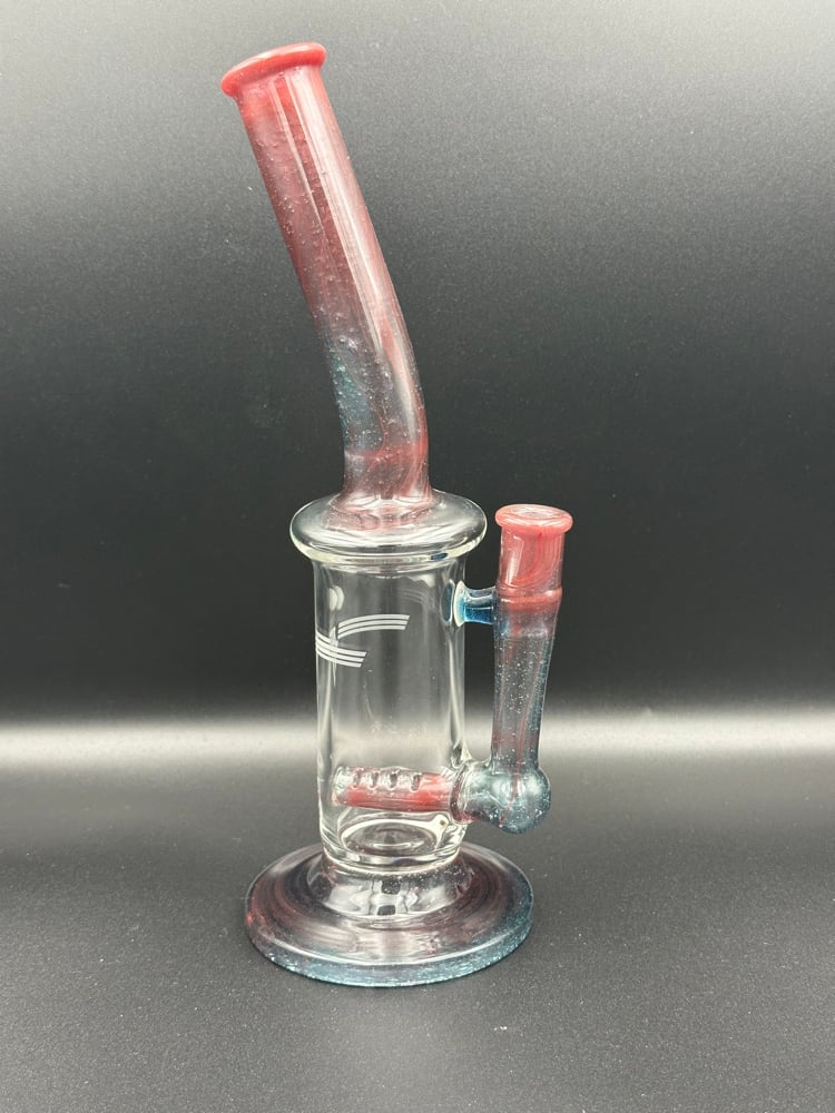 This mini stem line made with a custom red blue slushy color this piece has a 10 female hand ground joint with a 4 slit gridded perk. This piece stands 10inches tall with a 3.25 base.