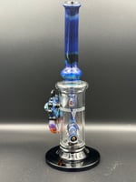 This mini stem line features deppes darkness. This piece sits 10" tall with 3.75 base hand ground 10 female hand worked joint with 4 slit gridded perk. This piece also features a nice space key with amber horns.