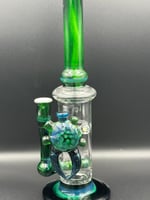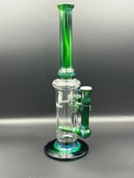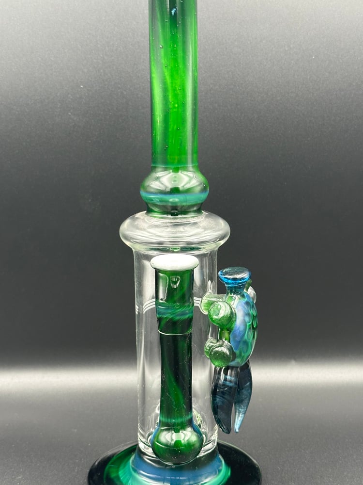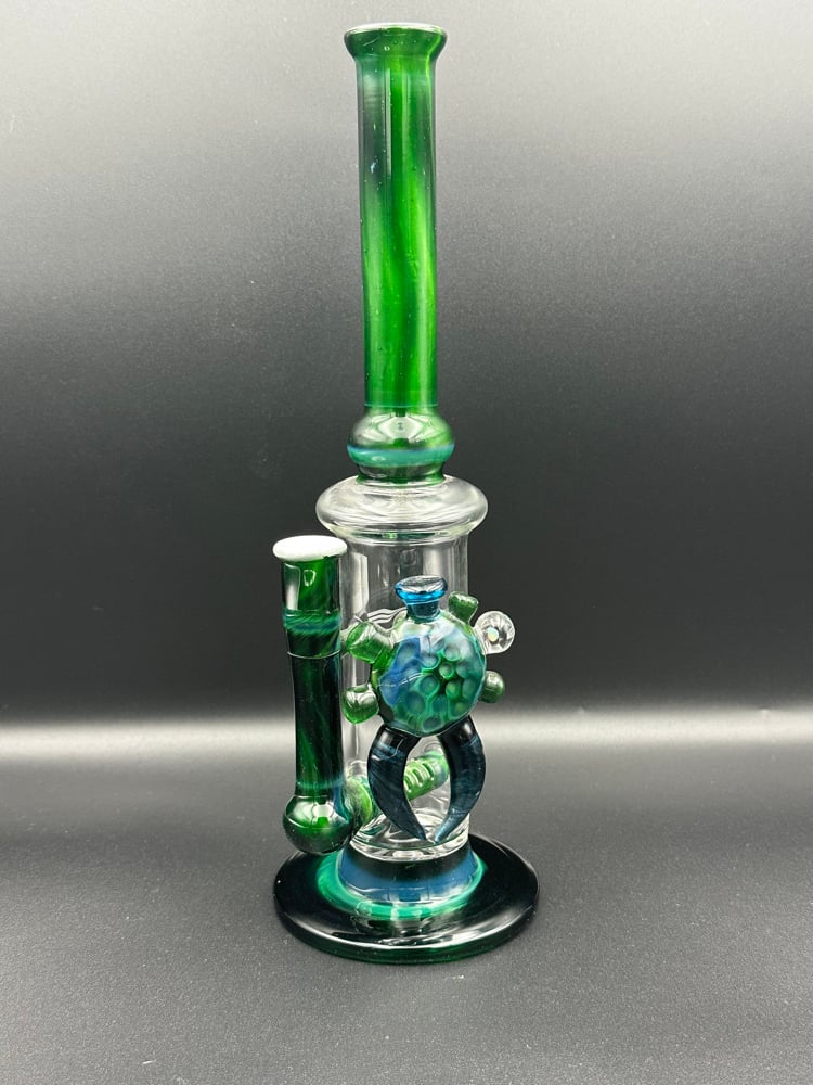 This mini stemline measures 11.5 with 3.75 base. This piece features a 10 female hand ground joint with a 4 slit gridded perk. This piece also has a nice honey comb space key attachment on the side