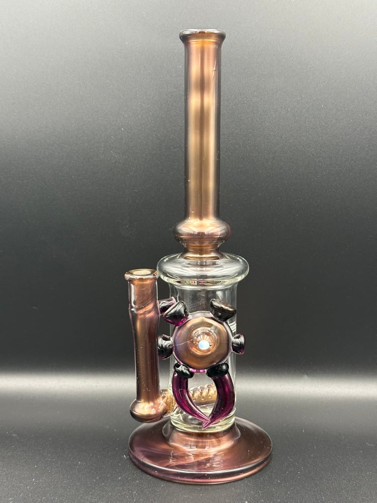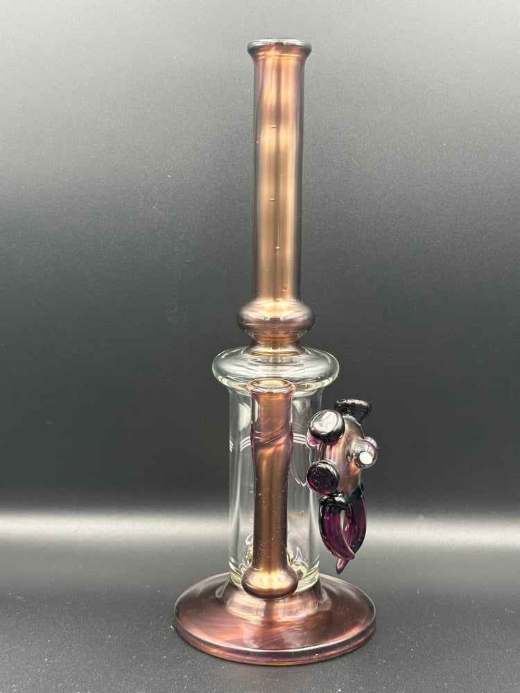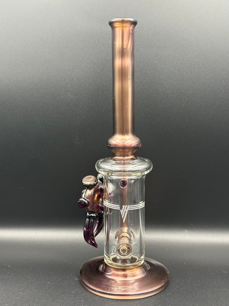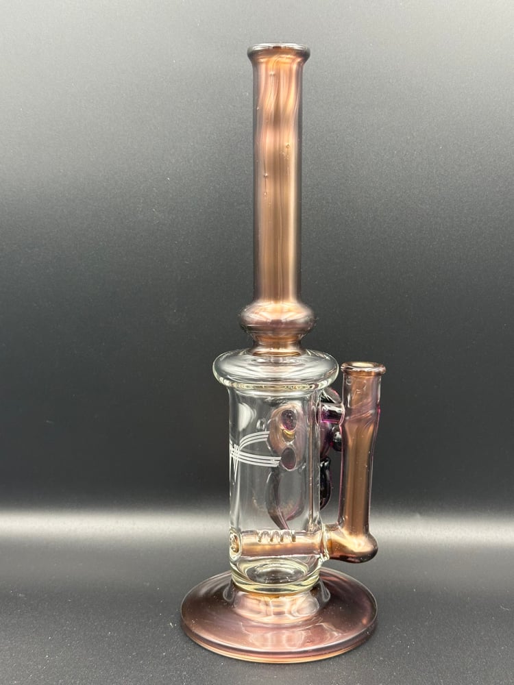 This gold amethyst over electrum piece stand 11 inches with 3.5 base this piece has a hand ground ten female joint with 4 slit gridded perk with space key attachment