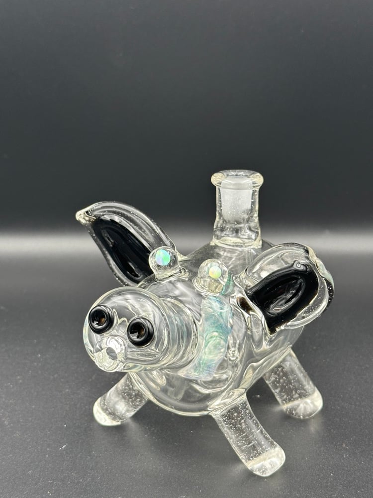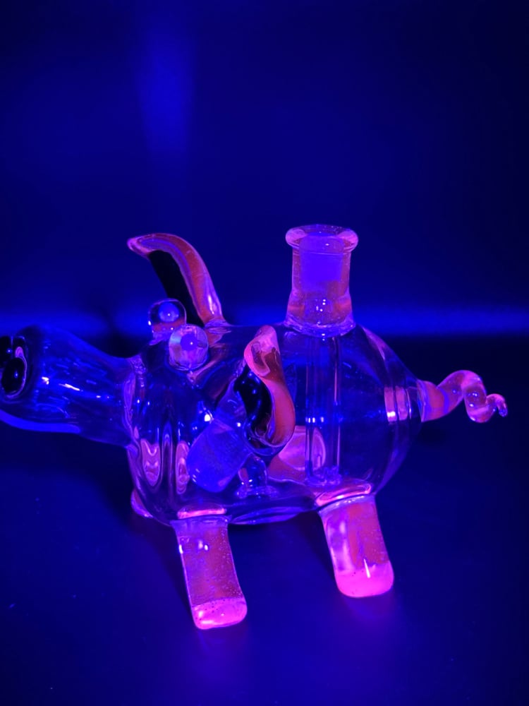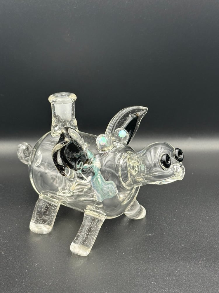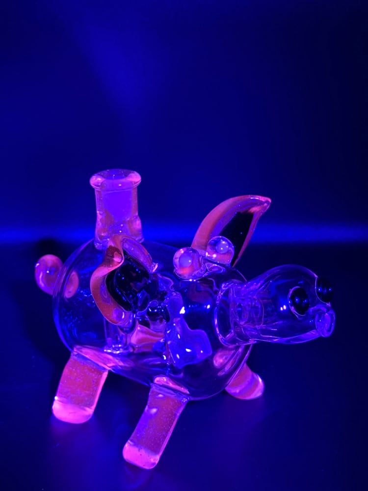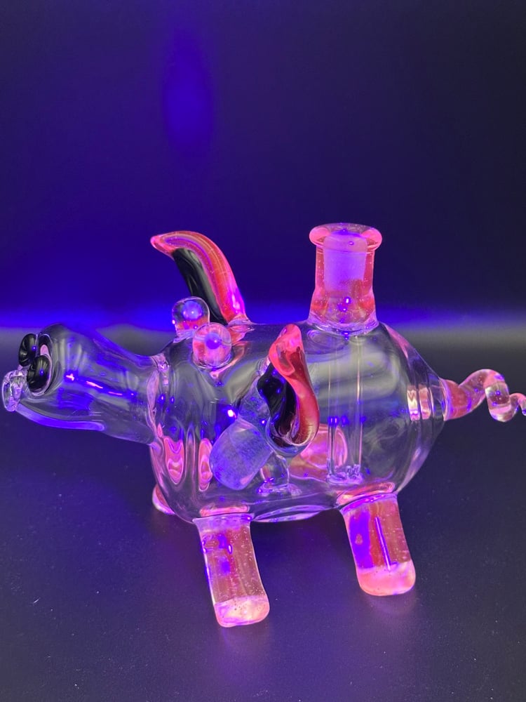 This piggy bank rig features Lucy uv glass and a dicro Lucy pigs foot inside the pig. This pig is 5 inches tall 7 inches long has a 10 female hand ground joint.