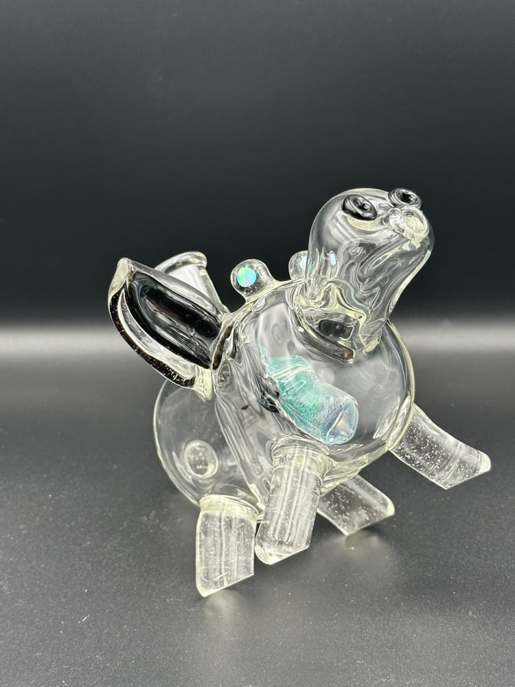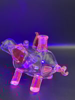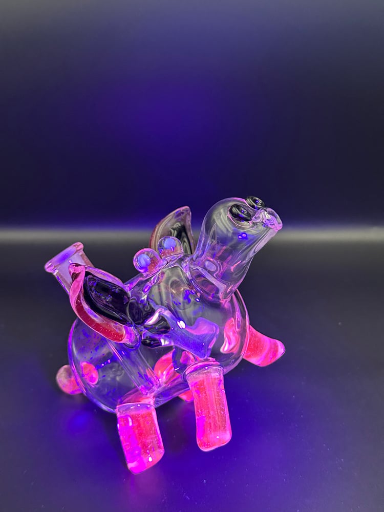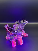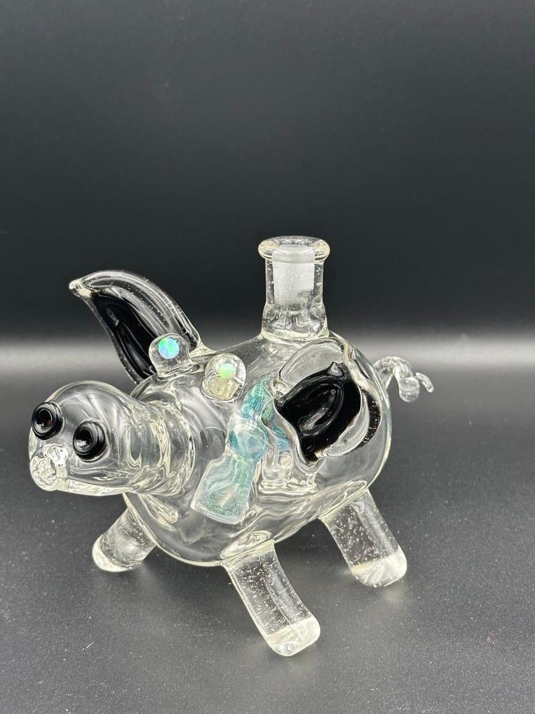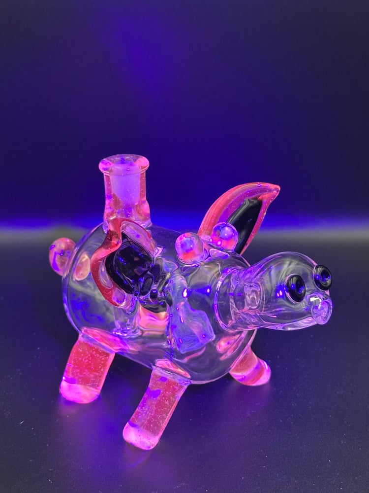 This piggy bank rig features Lucy uv glass and a dicro Lucy pigs foot inside the pig. This pig is 5 inches tall 7 inches long has a 10 female hand ground joint.