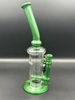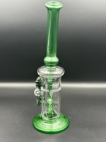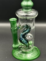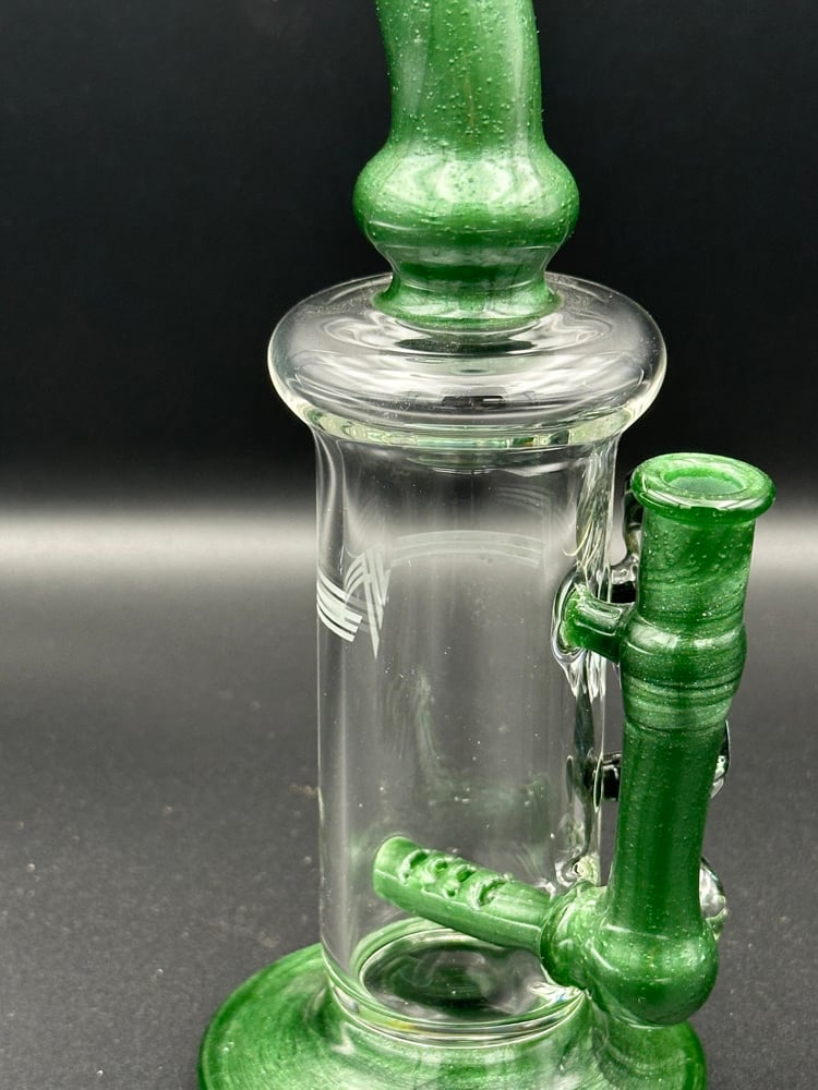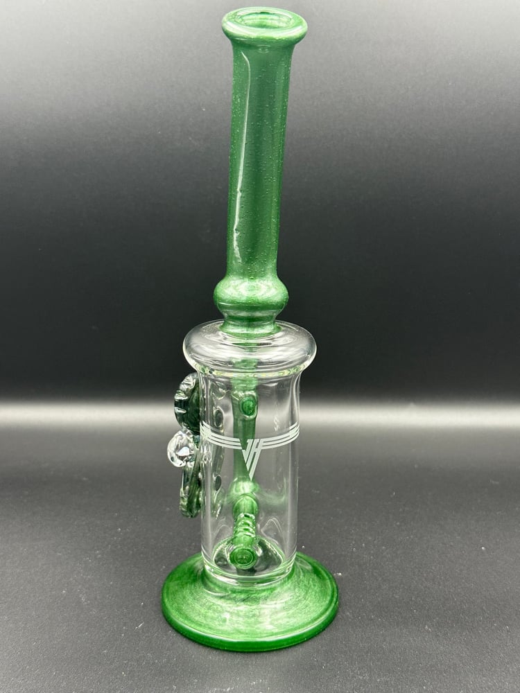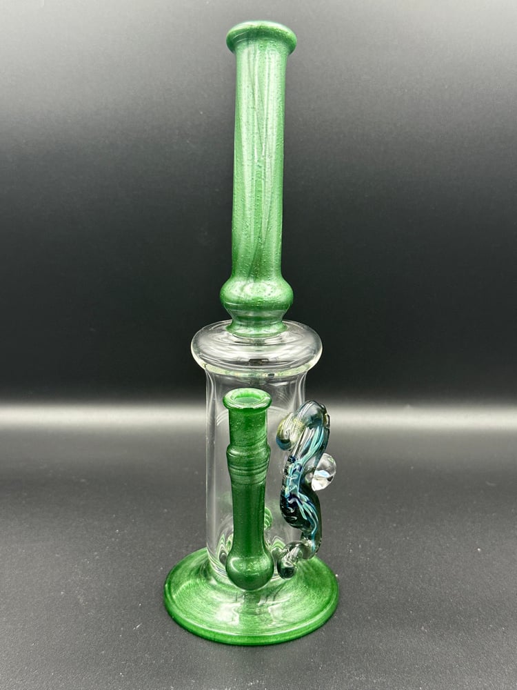 This mighty moss mini stem line stands 10 inches with 3 inch base this hand ground ten female with 4 slit gridded perk this piece also has a silver and gold implosion attachment