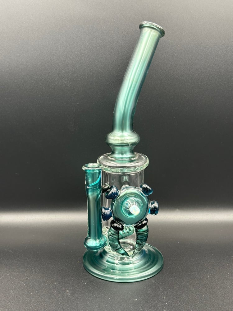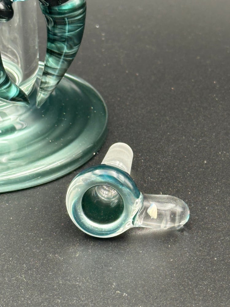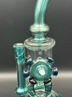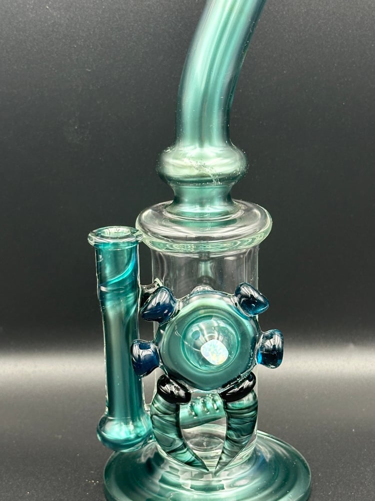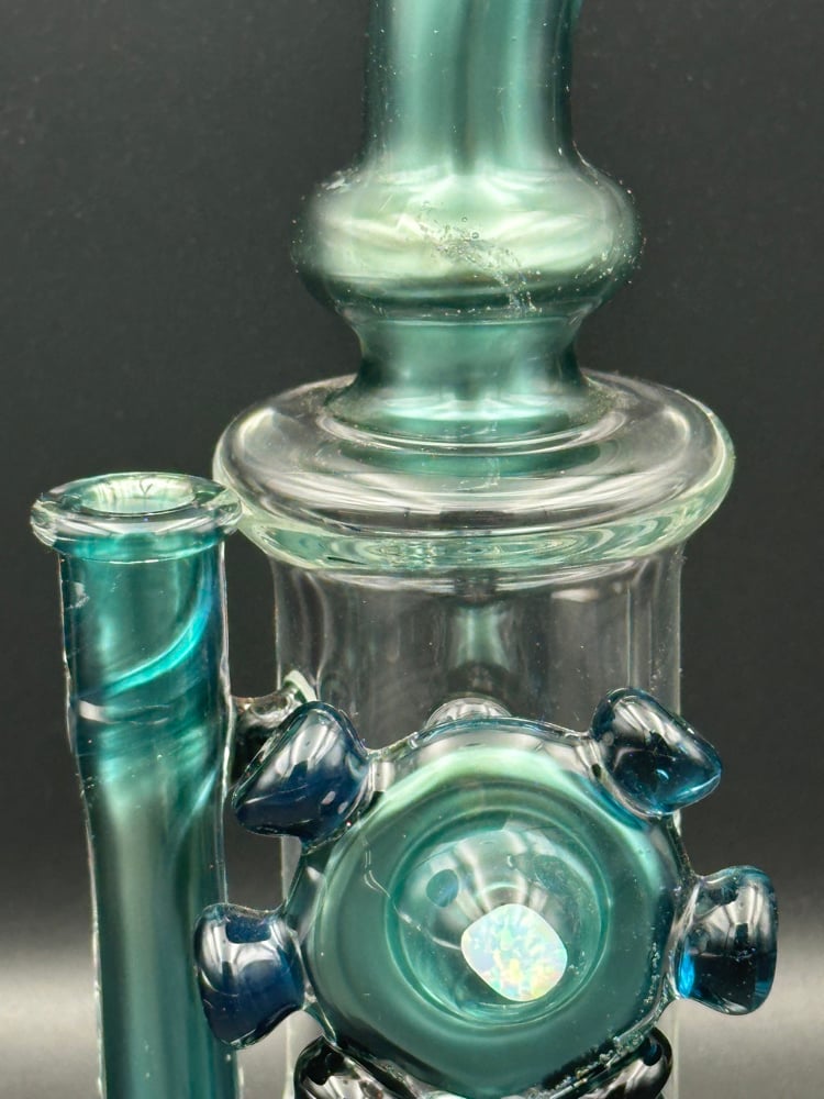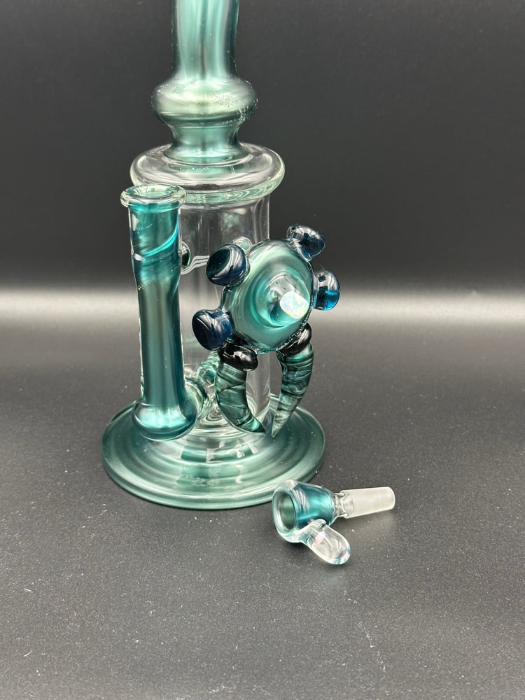 This blue beauty stands 10 inches tall with 3.75 inch base. This is a 10 female hand ground joint with 4 slit gridded perk. This piece has a nice space key attachment with a fat opal center. This piece me also comes with 10 male