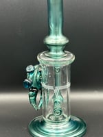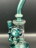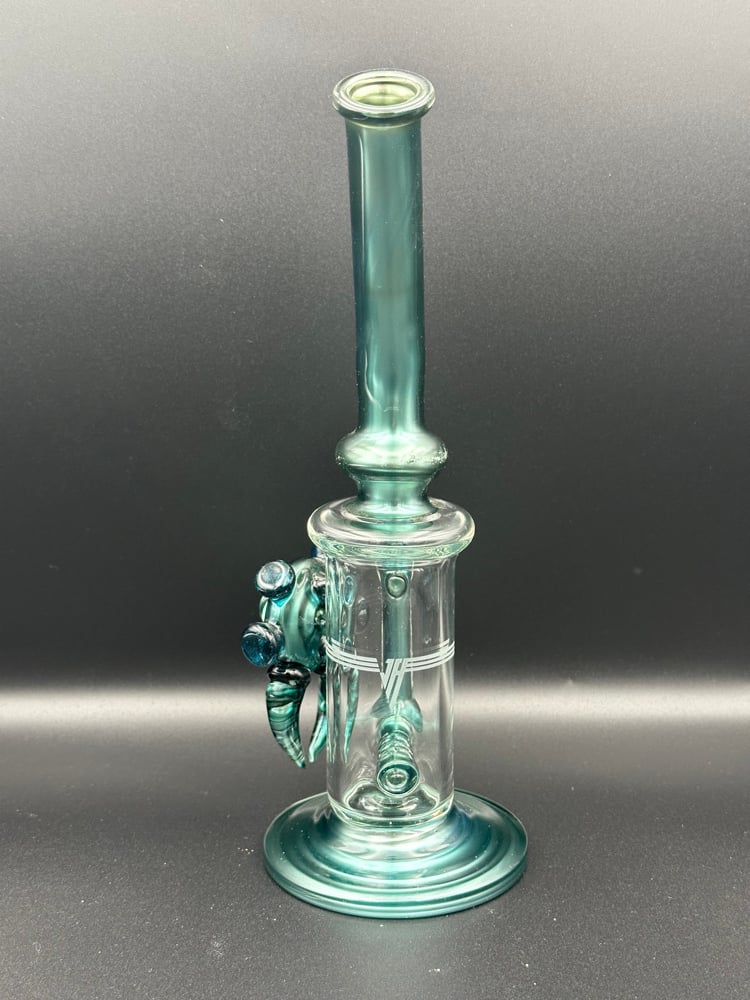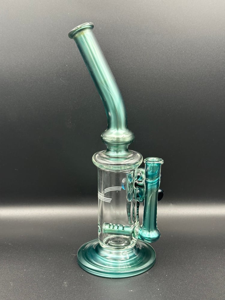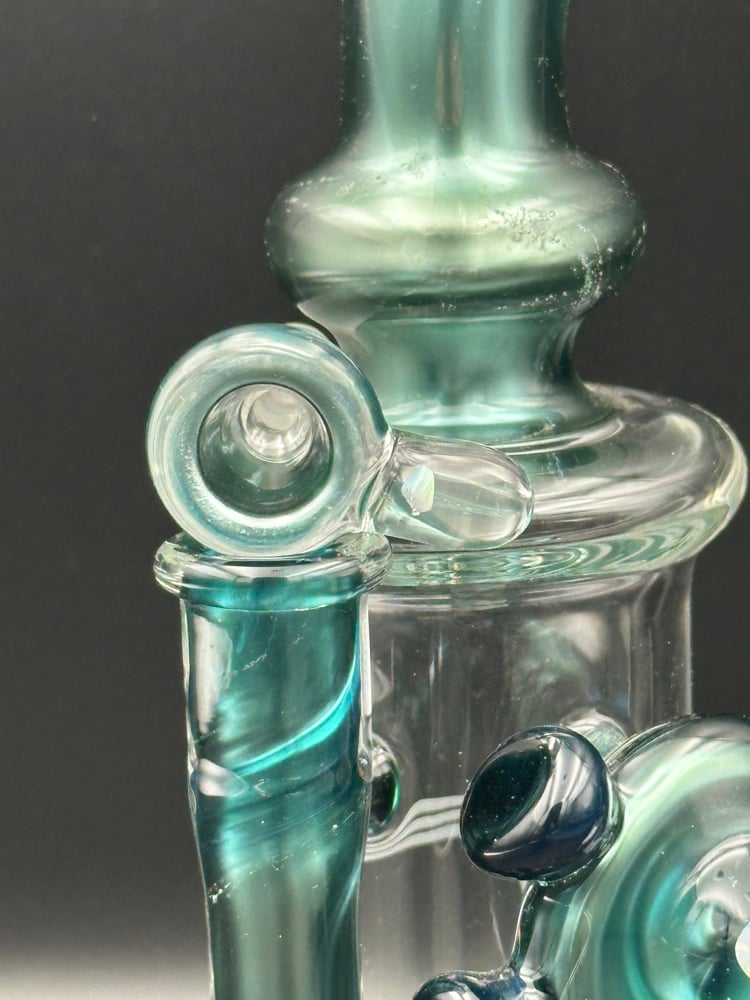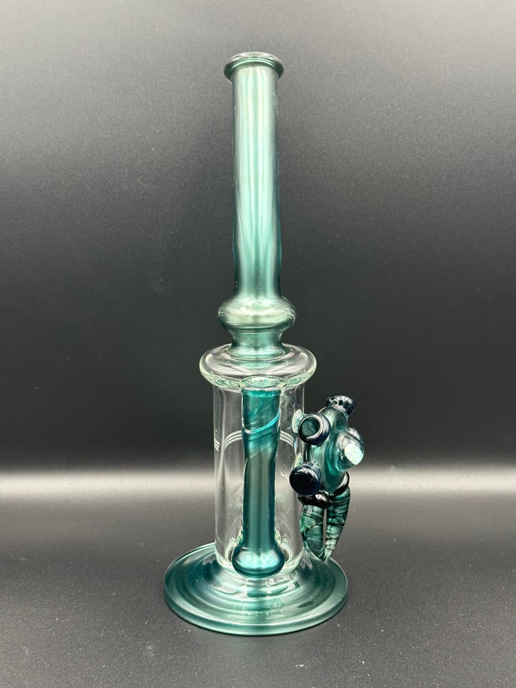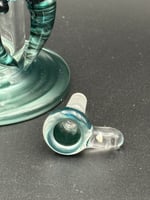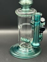 This blue beauty stands 10 inches tall with 3.75 inch base. This is a 10 female hand ground joint with 4 slit gridded perk. This piece has a nice space key attachment with a fat opal center. This piece me also comes with 10 male