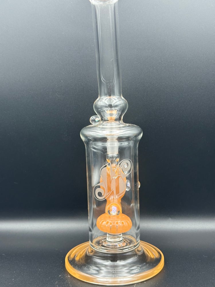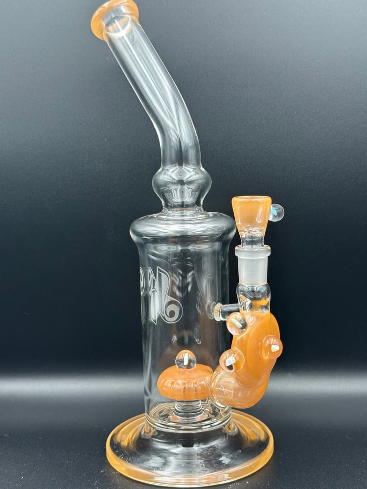 This single circ flower piece is one of my standard flower pieces. This piece is made with peach glass and features a 14 female with a single circ perk. This piece stands 12 inches tall with a bent neck. The bowl is a four hole bowl also has an opal that compliments the 4 other opals on the piece