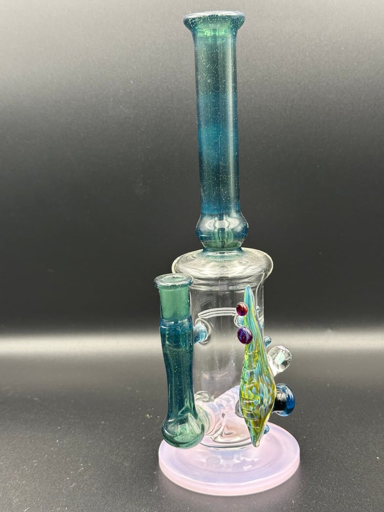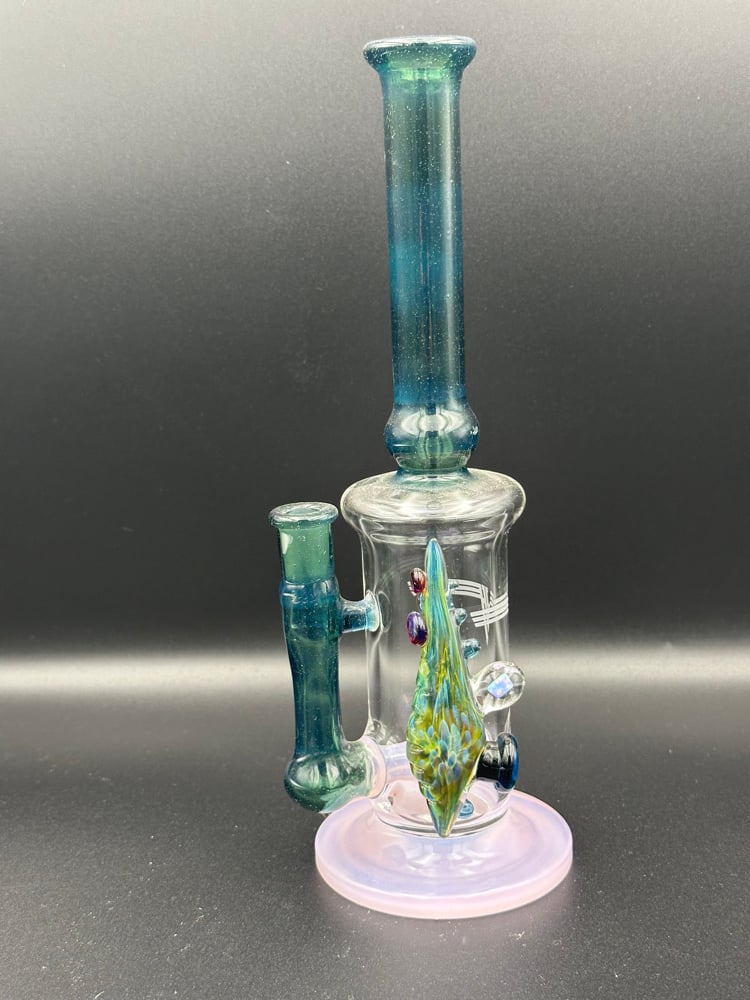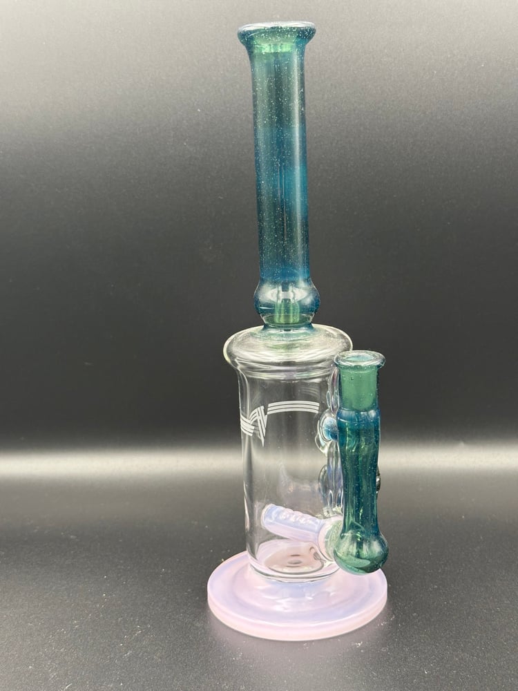 This pink and blue mini semolina stand 9.75 inches with 3 inch base. This piece features a hand ground 10 female joint with a 4 slit gridded perk. This pit also base a beautiful implosion marble attachment