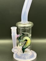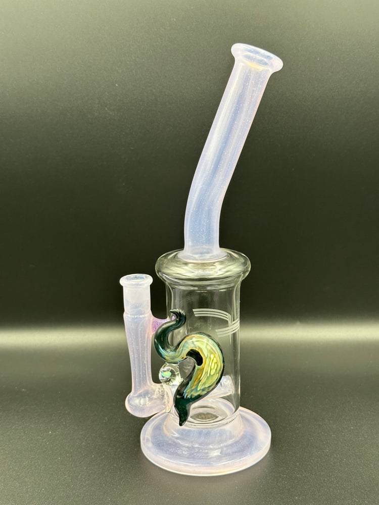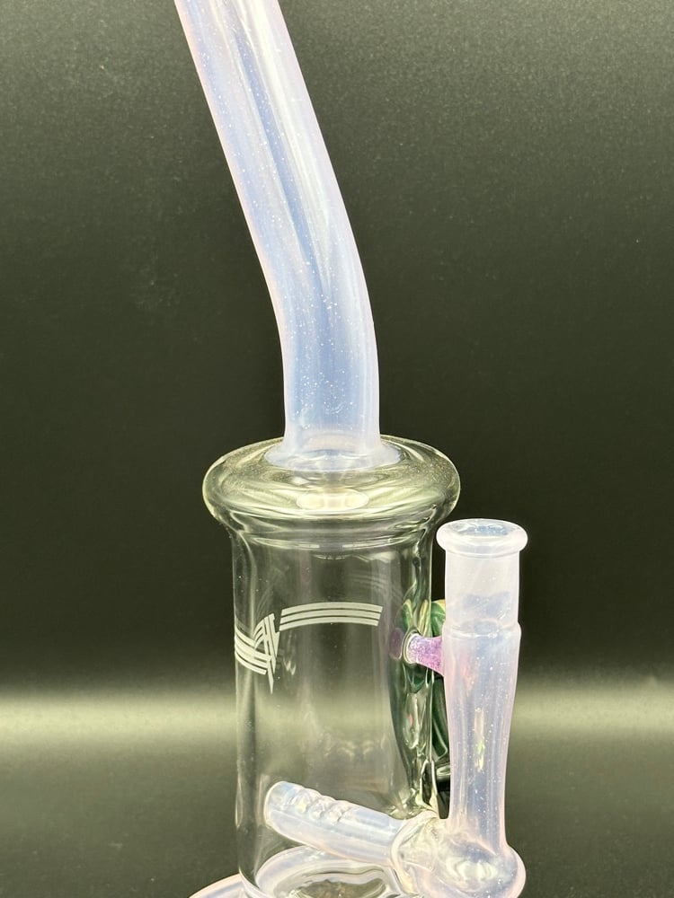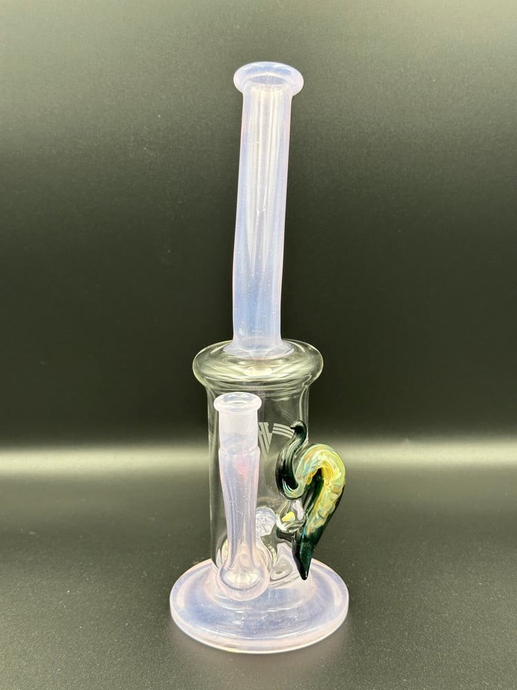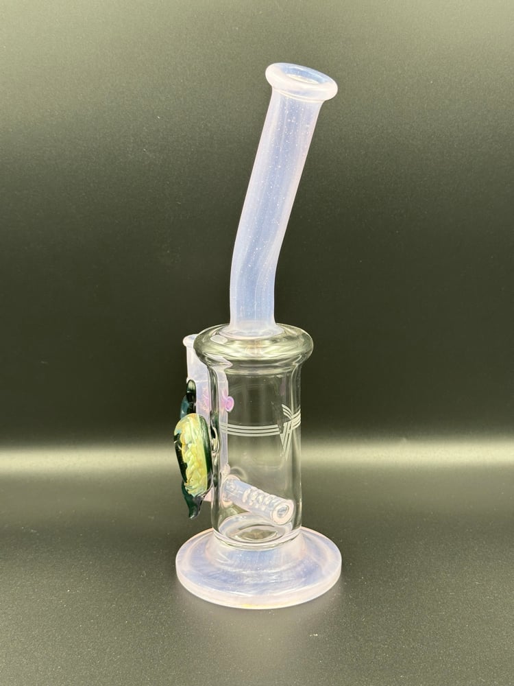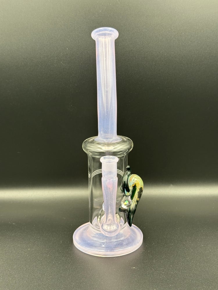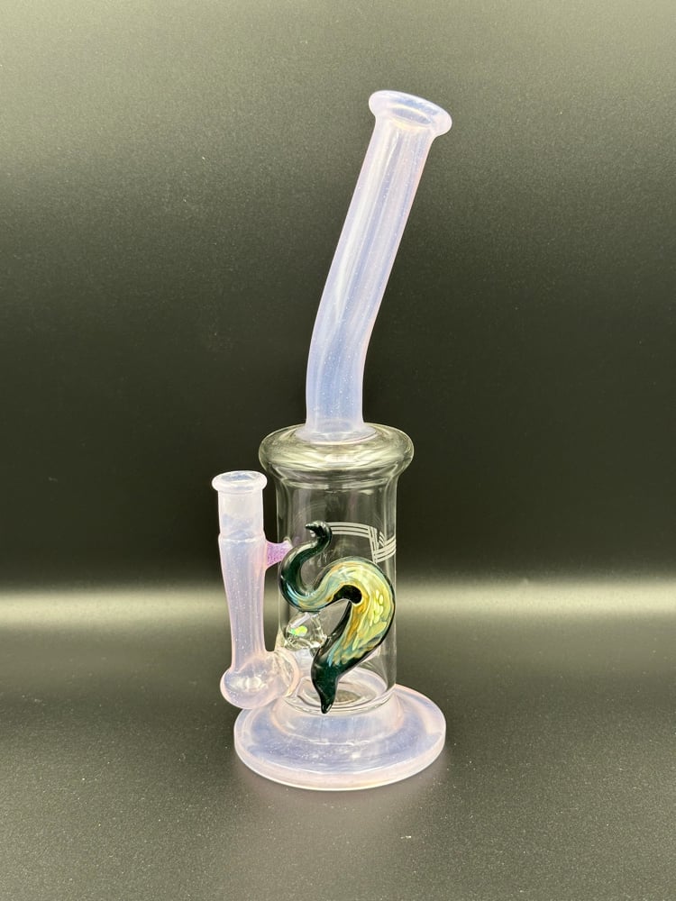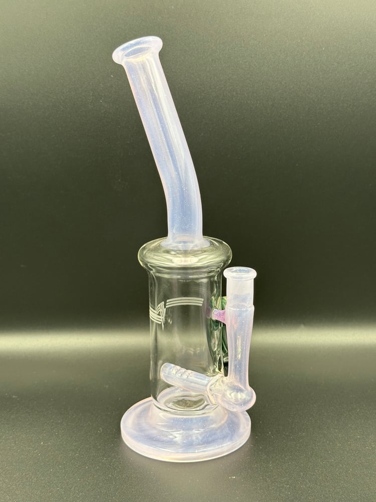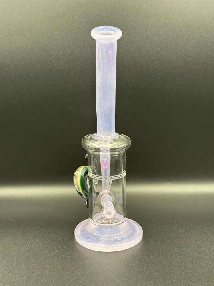 This pink mini stem line stands 9 inches tall with 3 inch base. This piece has a ten female hand ground joint with a 4 slit gridded perk. This pice features a fumed implosion attachment with an opal accents.