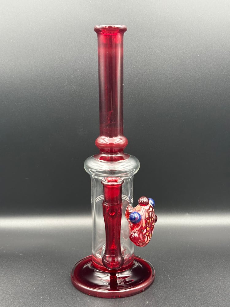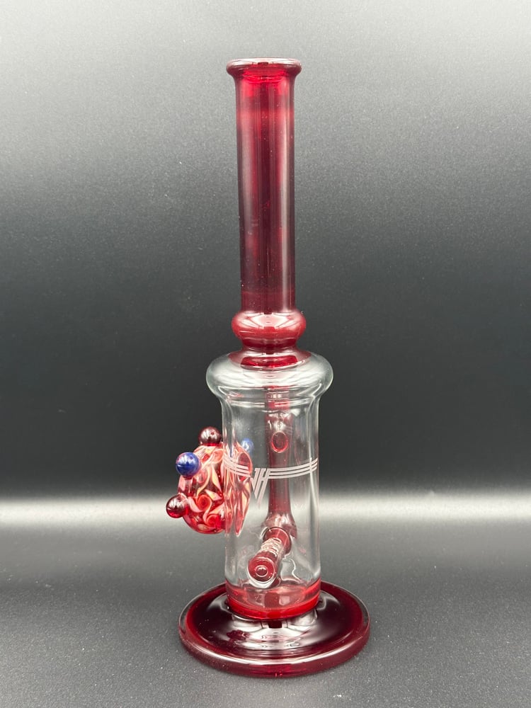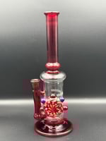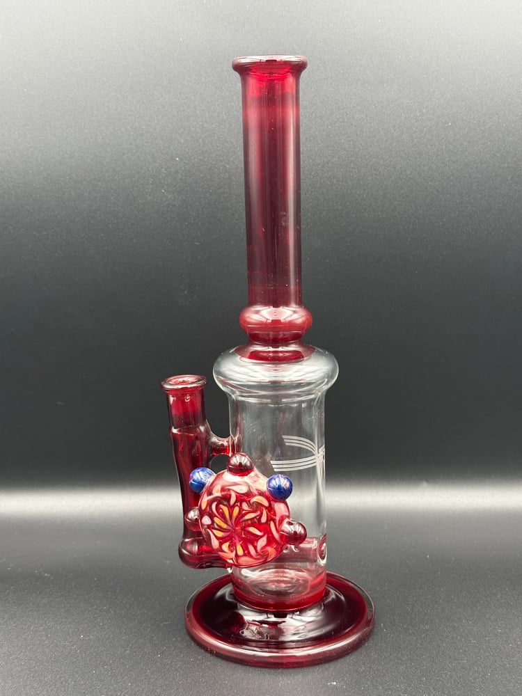 This ruby mini stem line is approximately 10 inches tall with 3.25 inch base. The hand ground ten female has a 4 slit girded perk. The disk on the side features amber pinwheel design.